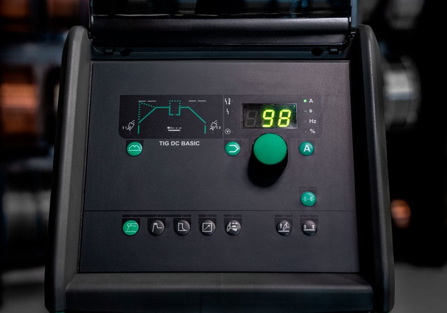 Всички AC функции се управляват чрез горната колона бутони. На всички панели горе вляво се показва заваръчният цикъл с неговите елементи, които могат да се настройват, като например предварителен газ, начален ток и крайно обдухване.